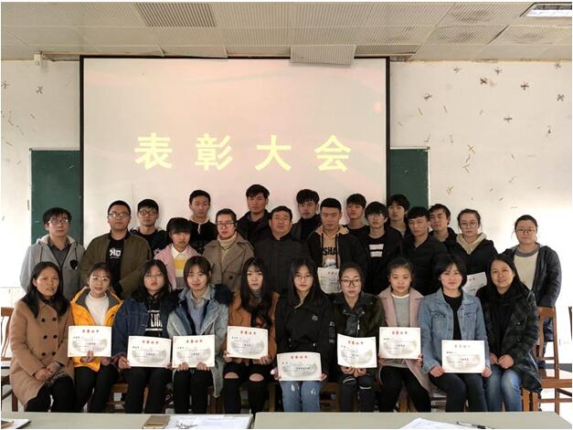 王明芳老师宣读表彰决定。时浩等6名同学获得“优秀班级干部”称号;艾健等14名同学获得“三好学生”称号;于子坤等12名同学获得成人高考前三名单项奖;张静娴获得通过“英语四、六级”单项奖;王召阳等5位同学获文体活动单项奖。与会老师为获奖同学颁发荣誉证书并合影留念。